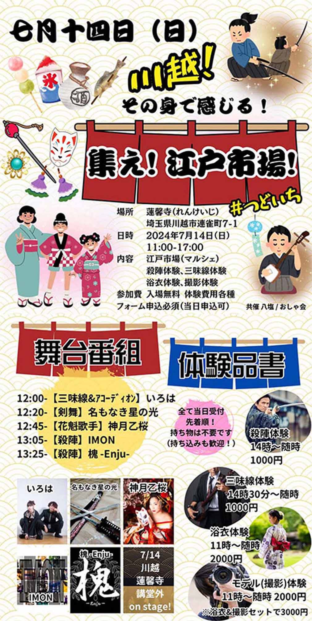最新情報 2025年 2024年 Wish Wish Fes. 子どもとペットの大切な命を守るための体験型防災フェス 【日付】2024年12月07日(土) 【場所】大門上池調節池広場 【住所】埼玉県さいたま市緑区美園2-1-191MAP 【出演情報】15:00~16:00 【詳細】WEBサイト 【ゲスト】 宮城 剛 宮下 浅葱 手を繋ごう!さいたま市市民活動 夢マルシェ! 【日付】2024年11月17日(日) 【場所】浦和駅東口駅前市民広場(駅前ロータリー横) 【住所】埼玉県さいたま市浦和区東高砂町11−1MAP 【出演情報】11:00~ 大宮第二公園 防災秋まつり 【日付】2024年11月09日(土) / 10日(日) 【場所】大宮第二公園 ひょうたん池周辺緑地 【住所】埼玉県さいたま市大宮区高鼻町4丁目MAP 【出演情報】09日(土)津軽三味線・和太鼓 16:30〜17:0010日(日)殺陣・津軽三味線・和太鼓 13:40〜(※15分前後する可能性が有ります。) 【詳細】WEBサイト Wish Wish Fes. 子どもとペットの大切な命を守るための体験型防災フェス 【日付】2024年11月02日(土) 【場所】大門上池調節池広場 【住所】埼玉県さいたま市緑区美園2-1-191MAP 【出演情報】15:30~16:30 【詳細】WEBサイト 【ゲスト】 宮城 剛 宮下 浅葱 手を繋ごう!さいたま市市民活動 夢マルシェ! 【日付】2024年10月20日(日) 【場所】浦和駅東口駅前市民広場(駅前ロータリー横) 【住所】埼玉県さいたま市浦和区東高砂町11−1MAP 【出演情報】14:30~ 【詳細】WEBサイト 米陸軍キャンプ座間 盆踊りフェスティバル 【日付】2024年08月03日(土) 【場所】在日米陸軍キャンプ座間 【住所】神奈川県座間市座間町1-1-1キャンプ座間MAP 【公演時間】20:15~20:45 その身で感じる!集え!江戸市場! 【日付】2024年07月14日(日) 【場所】蓮馨寺 【住所】埼玉県川越市連雀町7-1MAP 【出演情報】13:05~13:25 « 1 2 »